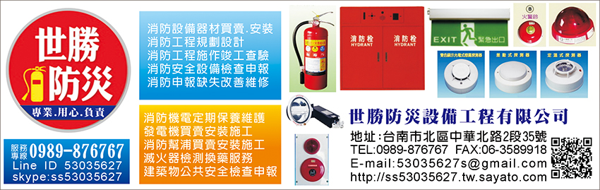 台南市消防器材、消防工程、消防申報、消防改善維修、消防保養維護、消防、發電機買賣安裝施工、滅火器檢測換藥服務、建築物公共安全檢查申報、台南消防工程、大樓消防保養、消防申報、消防勘驗、消防會勘簽證、消防規劃設計、消防預算編列、消防機電保養、滅火器、滅火器換藥、消防器材買賣、消防設備安裝、探測器、照明燈、出口燈、方向燈、消防水帶、發電機、消防泵浦、消防缺失改善、消防使用執照申請、消防檢測維修、緩降機、排煙工程、排煙閘門、廣播系統、火警系統、消防栓箱、灑水系統、泡沫工程、CO2填充、室內裝修申請、工程、器材、保養、換藥、施工、設備