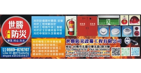 台南市消防器材、消防工程、消防申報、消防改善維修、消防保養維護、消防、發電機買賣安裝施工、滅火器檢測換藥服務、建築物公共安全檢查申報、台南消防工程、大樓消防保養、消防勘驗、消防會勘簽證、消防規劃設計、消防預算編列、消防機電保養、滅火器、滅火器換藥、消防器材買賣、消防設備安裝、探測器、照明燈、出口燈、方向燈、消防水帶、發電機、消防泵浦、消防缺失改善、消防使用執照申請、消防檢測維修、緩降機、排煙工程、排煙閘門、廣播系統、火警系統、消防栓箱、灑水系統、泡沫工程、CO2填充、室內裝修申請、工程、器材、保養、換藥、施工、設備