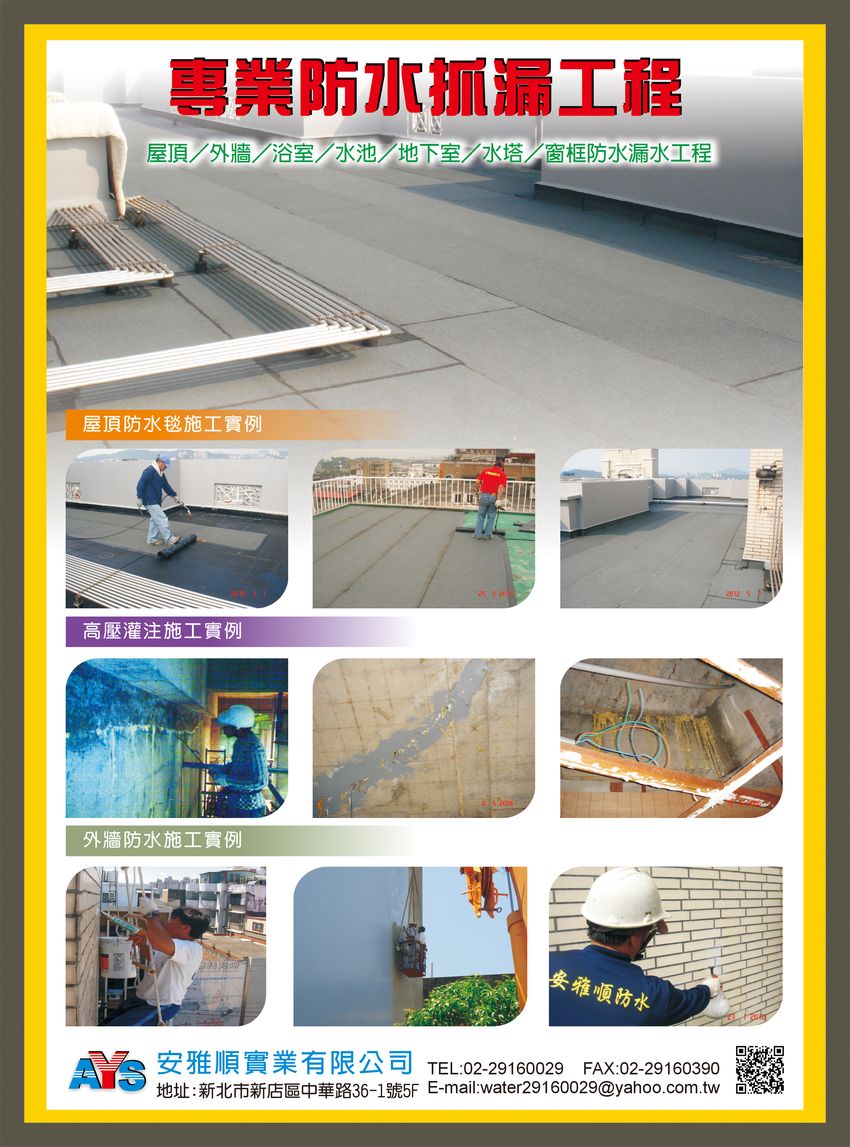 專營:防水抓漏、屋頂防水、外牆防水、浴室、水池、地下室、水塔、窗框漏水工程、外牆防水塗料、外牆無膜無色防水、女兒牆防水施作、屋頂防水毯施作、屋頂防水塗料施作、高壓灌注、防水工程、抓漏工程
