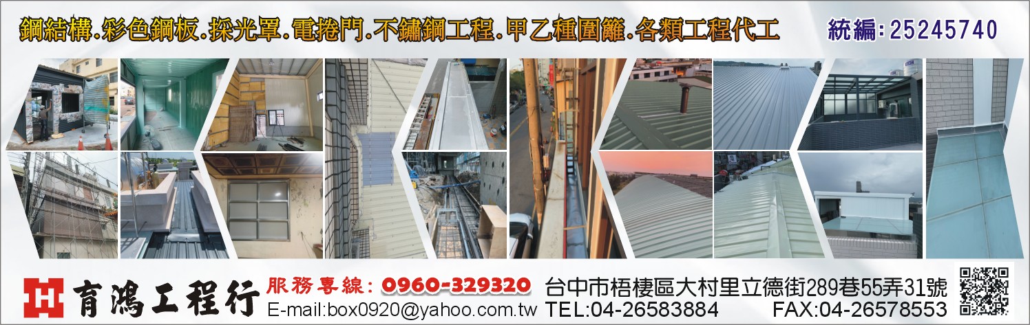 育鴻工程行專營烤漆浪板、鐵皮屋、裝潢壁板、防火板、琉璃鋼瓦、企口板、鐵捲門、採光罩、麒麟板、磁鋼板、磚型壁板、Z型鋼、C型鋼、電動捲門、白鐵門、白鐵窗、安全圍籬、欄杆、輕鋼架、樓層板...等。歡迎舊雨新知來電洽詢~