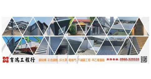 育鴻工程行專營烤漆浪板、鐵皮屋、裝潢壁板、防火板、琉璃鋼瓦、企口板、鐵捲門、採光罩、麒麟板、磁鋼板、磚型壁板、Z型鋼、C型鋼、電動捲門、白鐵門、白鐵窗、安全圍籬、欄杆、輕鋼架、樓層板