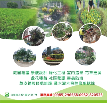 景觀養護、園藝設計、庭園維護、園藝造景、景觀設計、綠化工程、室內造景、花草更換、盆花種苗、害蟲防治、社區養護、喬木灌木移除修剪挖除、草皮鋪設修剪維護、社區大樓園藝植栽養護、公家機關園藝植栽養護、辦公大樓頂樓景觀設計維護、花台工程、地板人工植栽裝飾、植栽裝飾、陽台景觀工程、露臺景觀設計、樹木修剪、南方松工程、景觀造景工程、庭園綠化工程、花卉樹木工程設計、人造花樹造景、樹木保養、造園假山、步道、花藝設計、空中花園、台北景觀養護、台北園藝設計、台北庭園維護、台北造景、台北景觀設計、台北綠化工程、台北室內造景、台北社區大樓園藝植栽養護、台北大樓頂樓景觀維護、台北園藝養護、新北園藝、新北樹木保養維護、新北樹木修剪、新北造景、新北草皮保養、新北庭園綠化、新北植栽設計、新北樹木挖除、新北植栽修剪、新北社區園藝維護
