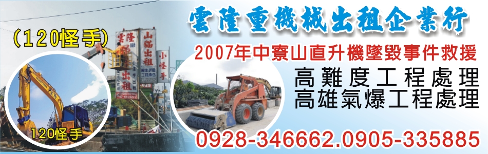 雲隆山貓出租是高雄地區山貓出租的專業工程公司,30年以上經驗專營山貓出租,怪手出租、120怪手、山貓破碎機、掃路機、15噸吊卡車、南北貨運、樹木修剪、灑水車、搬家、拆屋、工廠拆除、廢土、廢棄物處理、貨櫃屋買賣,整地工程,檔土牆工程,圍離工程...等