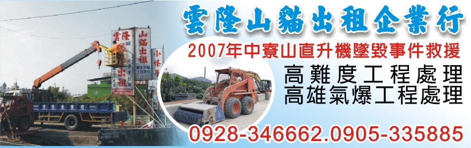 雲隆山貓出租是高雄地區山貓出租的專業工程公司,30年以上經驗專營山貓出租,怪手出租、120怪手、山貓破碎機、掃路機、15噸吊卡車、南北貨運、樹木修剪、灑水車、搬家、拆屋、工廠拆除、廢土、廢棄物處理、貨櫃屋買賣,整地工程,檔土牆工程,圍離工程...等