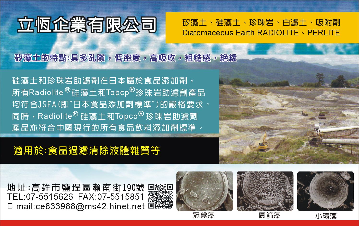 本公司專營食品級之矽藻土、硅藻土、Diatomaceous Earth RADIOLITE、珍珠岩、白濾土、PERLITE、吸附劑,歡迎舊雨新知來電洽詢!