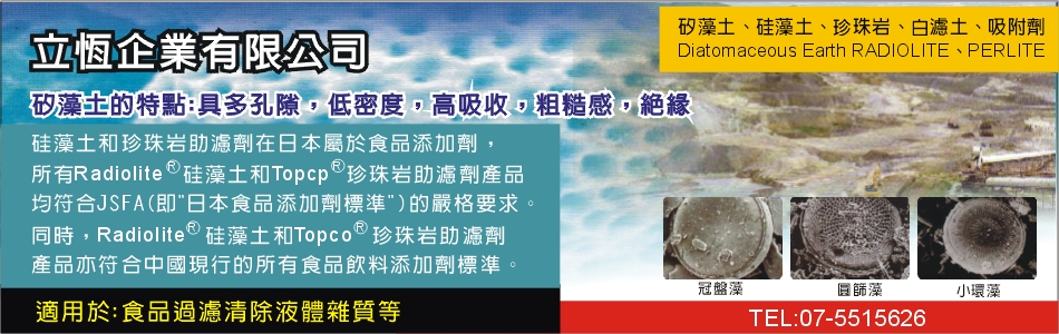 本公司專營食品級之矽藻土、硅藻土、Diatomaceous Earth RADIOLITE、珍珠岩、白濾土、PERLITE、吸附劑,歡迎舊雨新知來電洽詢!