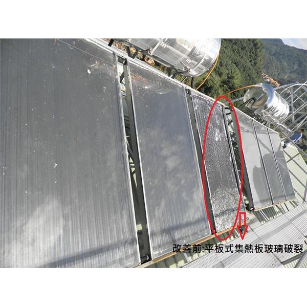 • 平板式集熱板,因集熱玻璃破裂,熱吸收低,無熱水可使用。