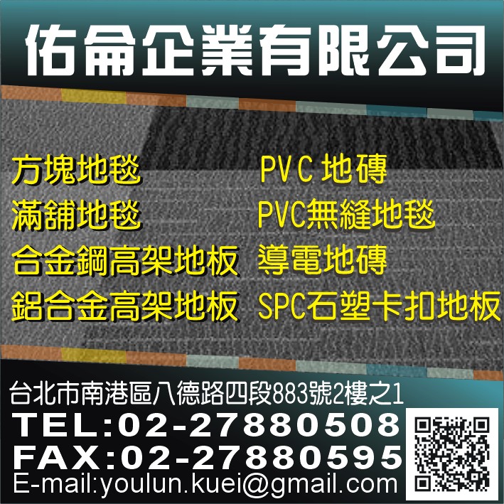 方塊地毯、滿鋪地毯、合金鋼高架地板、鋁合金高架地板、PVC地磚、導電地磚、SPC石塑卡扣地板,各類型地磚、地板皆在佑侖!