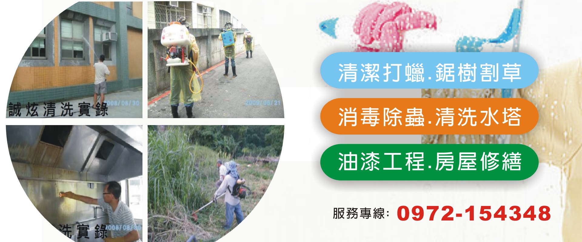 清潔打蠟、鋸樹割草、消毒除蟲、清洗水塔、油漆工程、房屋修繕...等,歡迎來電由專人為您服務!