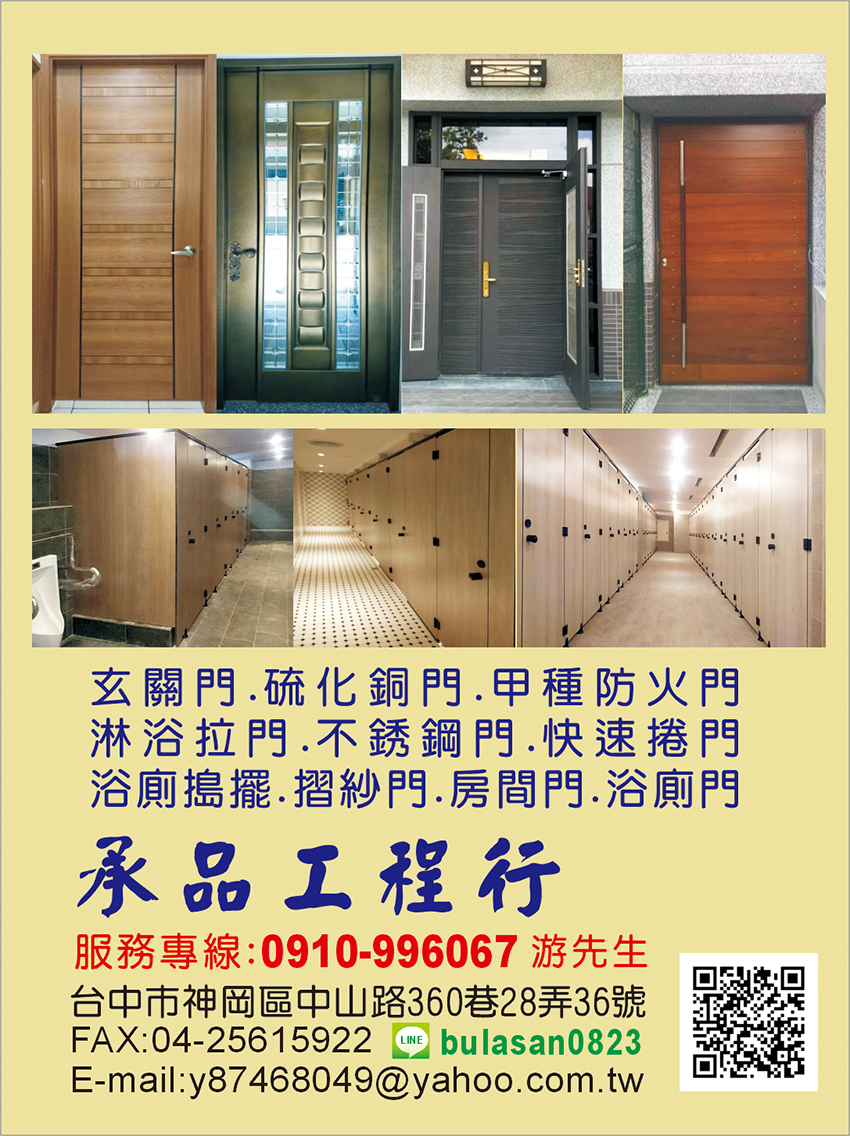 玄關門、硫化銅門、甲種防火門、房間門、浴廁門、淋浴拉門、不鏽鋼門、三合一鋁門、防盜紗門、快速捲門、捲門、廁所隔間搗擺、隔間搗擺、搗擺、日式折紗、台中房間門、台中快速捲門、台中日式折紗、浴廁搗擺、專營各式門組、台中捲門、台中玄關門、台中搗擺、台中玄關門、台中防盜紗門、台中甲種防火門、玄關、防火、室內