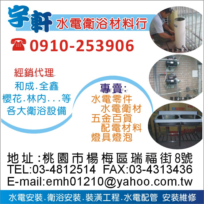 水電工程、水電衛浴材料、水電零件、五金百貨、配電材料、燈具燈泡、水管配管、電錶申請、代辦水錶、照明器具、室內配線、工廠配電、電力申請、弱電工程、水電安裝、衛浴安裝、裝潢工程、房屋修繕工程、衛浴磁磚、LED節能燈具、消防機電、廚房修繕、淋浴柱安裝、馬桶安裝、臉盆更換、馬桶更換、淨水器、排油煙機、瓦斯爐、熱水器、淋浴拉門、廚具櫥櫃、辦公室裝潢、店面裝潢、室內裝修、房屋新建、地磚翻新、油漆工程、泥作工程、套房改建、舊屋翻修、桃園縣五金零件、桃園縣電線配管、桃園縣衛浴安裝、桃園縣防水抓漏、桃園縣家庭水電、桃園縣浴室配件、桃園縣洗水塔、楊梅水電材料、楊梅水電工程、楊梅洗水塔、楊梅鎮電線配管、楊梅鎮衛浴安裝、楊梅鎮防水抓漏工程、楊梅鎮家庭水電、楊梅鎮浴室配件、楊梅鎮水電五金零件、楊梅專賣水電零件、楊梅水電衛材