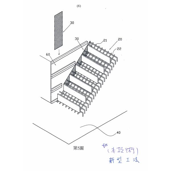 台灣專利字號 M483971 混凝土樓梯與牆板之鋼筋結構的專利權,此工法可有效強化樓梯與牆板之連結強度及提高混凝土之結構硬度,且因為此技術之特性可在縮短灌漿之作業時間,進而縮短您的建築工時,這是一個讓您雙贏之技術工法(增加強度、縮短工時),我們期待與您合作!!