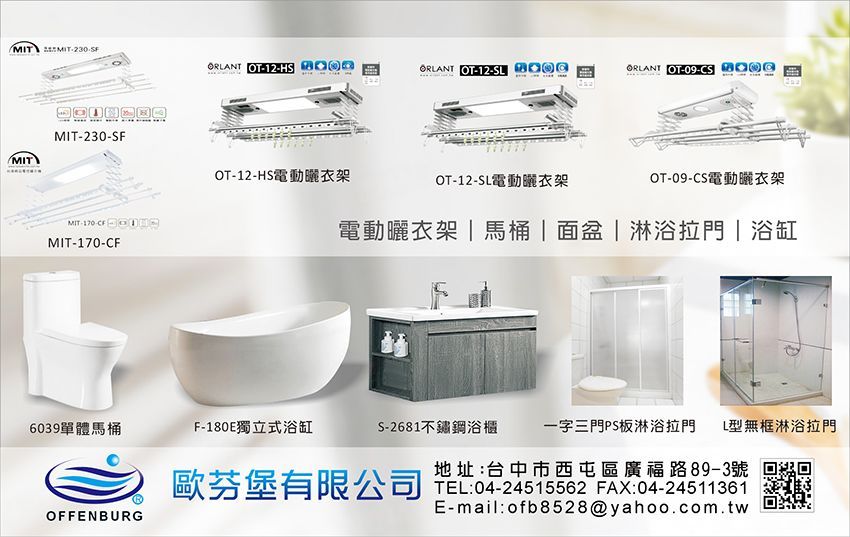 歐芬堡有限公司自民國96年10月成立以來,即秉持著「服務熱忱,產品創新,通路多元」的經營理念,並堅定以一步一腳印的經營方式,持續成長,永遠創新,期能成為國內最優良的衛浴設備及電動曬衣架供應商!