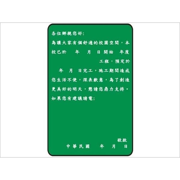昵豪有限公司提供專業的柔性告示牌,採用高品質鋁板經陽極處理,具備防水、防曬功能,適用於各類建築工地。尺寸為75×120公分,字體為白色正楷,符合臺北市工程施工規範,確保施工現場資訊清晰可見。
