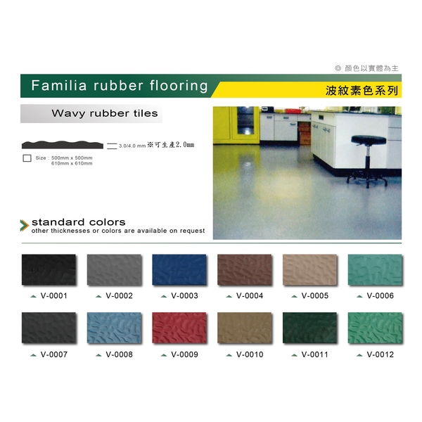 美觀、高耐用性、抗躁音、防滑性、行走舒適、色樣多、自由選色搭配設計、維護成本低、維修易...等