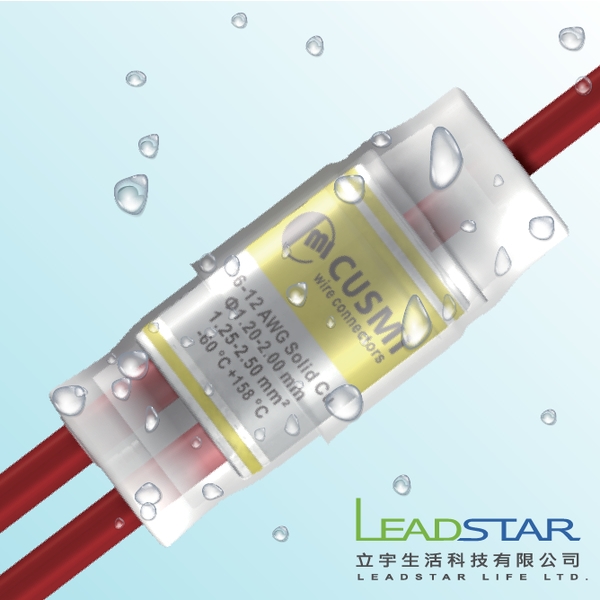 卡速密金牌接頭,具專利結構「弧形溝槽、高彈性鋼片、雙向插接、特殊絕緣塑膠」多項優點,搭配專用防水套,可達IP68等級。