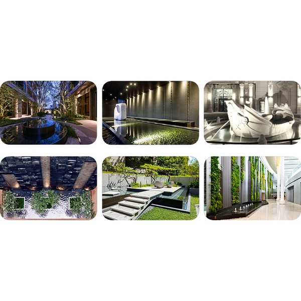 噴泉池、鏡面池、流曝池、雕塑出水、造型出水、河道池等都屬於景觀池之一環,通常會搭配燈光及水流,營造出業主想要的視覺效果及聽覺效果。