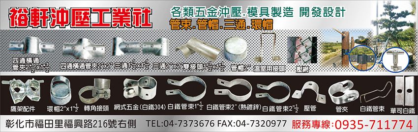 五金沖壓、五金模具製造、五金開發設計、五金材料、管束、水管束、管帽、三通、四通、環帽、卡車四鏡頭底座、四通橫通管夾、雙接頭、網室五金、白鐵管束、白鐵熱鍍鋅管束、溫室五金材料、溫室配件、菱型網五金、溫室五金、溫室五金配件、溫室材料、五金配件、各式沖壓、轉角、葫蘆夾、子母型管束、葫蘆束、管夾、白鐵熱鍍鋅、菱形網五金、各式五金沖壓、各式模具製造、各式模具開發、各式模具設計、彰化五金、彰化沖壓、彰化模具、彰化材料、彰化五金材料、彰化溫室、彰化菱型網、彰化五金配件、彰化溫室配件、三通接頭、溫室用接頭、轉角接頭、鷹架配件、壓管