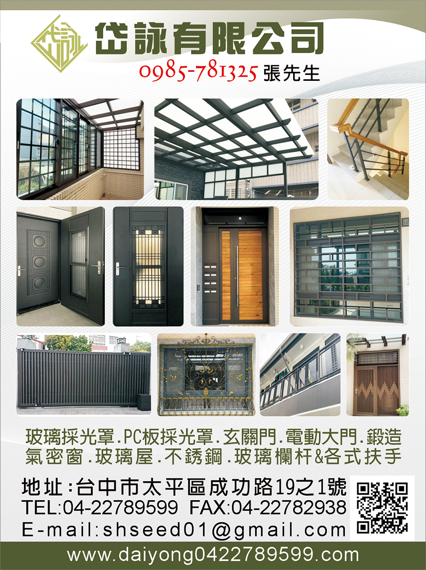 台中鍛造鐵門窗、台中東區採光罩工程、彰化不銹鋼採光罩、南投玻璃採光罩、苗栗不鏽鋼玻璃採光罩、台中PC板採光罩、霧峰玻璃採光罩、沙鹿採光罩、台中雨遮施工、太平不銹鋼雨遮、南投玻璃雨遮、大雅鍛造玄關門、大里空中花園、台中北屯玻璃屋施工、草屯玻璃屋、彰化和美玻璃屋、南投日式格柵、台中西區防盜門窗、埔里防盜門窗、新社防盜門窗、台中鍛造門窗、烏日潭子鍛造門窗、北區南區鍛造門窗、台中玄關內外門、南屯玄關內外門、台中日式格柵、北屯日式格柵、大里扶手欄杆設計、台中鍛造欄杆、台中市鍛造格柵欄杆、台中氣密窗施工、彰化氣密窗、台中百葉窗、南投百葉窗、台中東區南方松地板、台中西區南方松格柵、苗栗鍛造採光罩、太平玻璃採光罩、苗栗採光雨遮、埔里玻璃採光罩施工、專營藝術鍛造門、藝術鍛造窗、精品訂製、欄杆、扶手、不銹鋼防盜門窗、日式格柵、日式欄杆、玻璃欄杆、庭院大門、鍛造採光罩、玻璃採光罩、PC板採光罩、各式雨遮、南方松木地板、南方松格柵、鋁氣密窗、百葉窗、玄關內外門、電動捲門、新式鐵皮屋不銹鋼防盜門窗、鍛造欄杆、鍛造鐵窗、鍛造門窗、鍛造扶手、鍛造大門、鍛造採光罩、不銹鋼噴砂玻璃採光罩、不銹鋼反射、玻璃採光罩及雨遮系列、空中花園、鍛造精品、鍛造樓梯、鍛造車庫、鍛造窗、南方松採光罩、鍛花採光罩、強化噴砂玻璃採光罩、南方松採光罩、不銹鋼玻璃壓板、各式金屬建材設計、岱詠