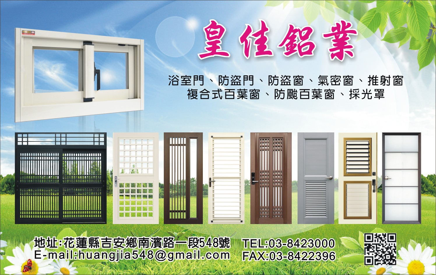 經營項目:防颱氣密窗、靜音氣密鋁窗、隔音氣密窗、浴室門、防盜門窗、PS板門、氣密窗、推射窗、防颱百葉窗、鋁合金百葉窗、採光罩、鈦鋁合金防盜門、格子窗、鋁門窗、藝術門、穿梭防盜窗、鈦鋁合金浴室門、鋁合金門斗、通風百葉窗、通風門、氣密鋁窗、多功能百葉窗、鋁防火門...等。