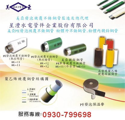 美亞發泡被覆不銹鋼管、美亞發泡被覆不銹鋼壓接熱水明管、美亞發泡被覆不銹鋼壓接熱水暗管、美亞發泡被覆不銹鋼壓接冷水明暗管、壓接管、PE發泡保溫帶、美亞不銹鋼管壓接管、配管固熔化不銹鋼壓接管配管、不銹鋼鍍鋅鋼牙口焊接彎頭三通法蘭配件、美亞鍍鋅鋼管、美亞碳鋼管、壓力碳鋼管、美亞無螺紋薄鋼導線管、厚鋼電線管、特厚鋼導線管、美亞鍍鋅園藝管、美亞內鍍鋅外粉體鋼管消防防蝕用、美亞外粉體不銹鋼管防蝕、特殊不銹鋼管鋼管、機械接頭配件、美亞高密度PE防蝕被覆地下埋設鍍鋅鋼管、不銹鋼管、球狀石墨鑄鐵管、可撓性防水防火防爆保護軟管、防水熱鍍鋅金屬軟管、防水熱鍍鋅金屬軟管、TCM熱鍍鋅軟管、鋅合金防水盒接管接、不銹鋼軟管、不銹鋼防水軟管、防爆軟管、防爆選擇開關箱、防爆插頭座、防爆EYS密封接、銅製鑄鐵不銹鋼凡而、SW炮金銅加強型牙接另件、減壓閥、日泰凡而、JF通力避震軟管、鍍鋅不銹鋼角鐵牙條C型鋼