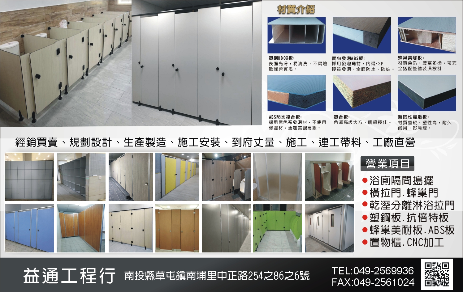 本公司深耕中部地區已數十年,專營廁所搗擺、公共場所浴廁規劃,以及各式門組、塑鋼板蜂巢美耐板、ABS板...等,提供免費丈量、估價,歡迎各機關團體來電洽詢