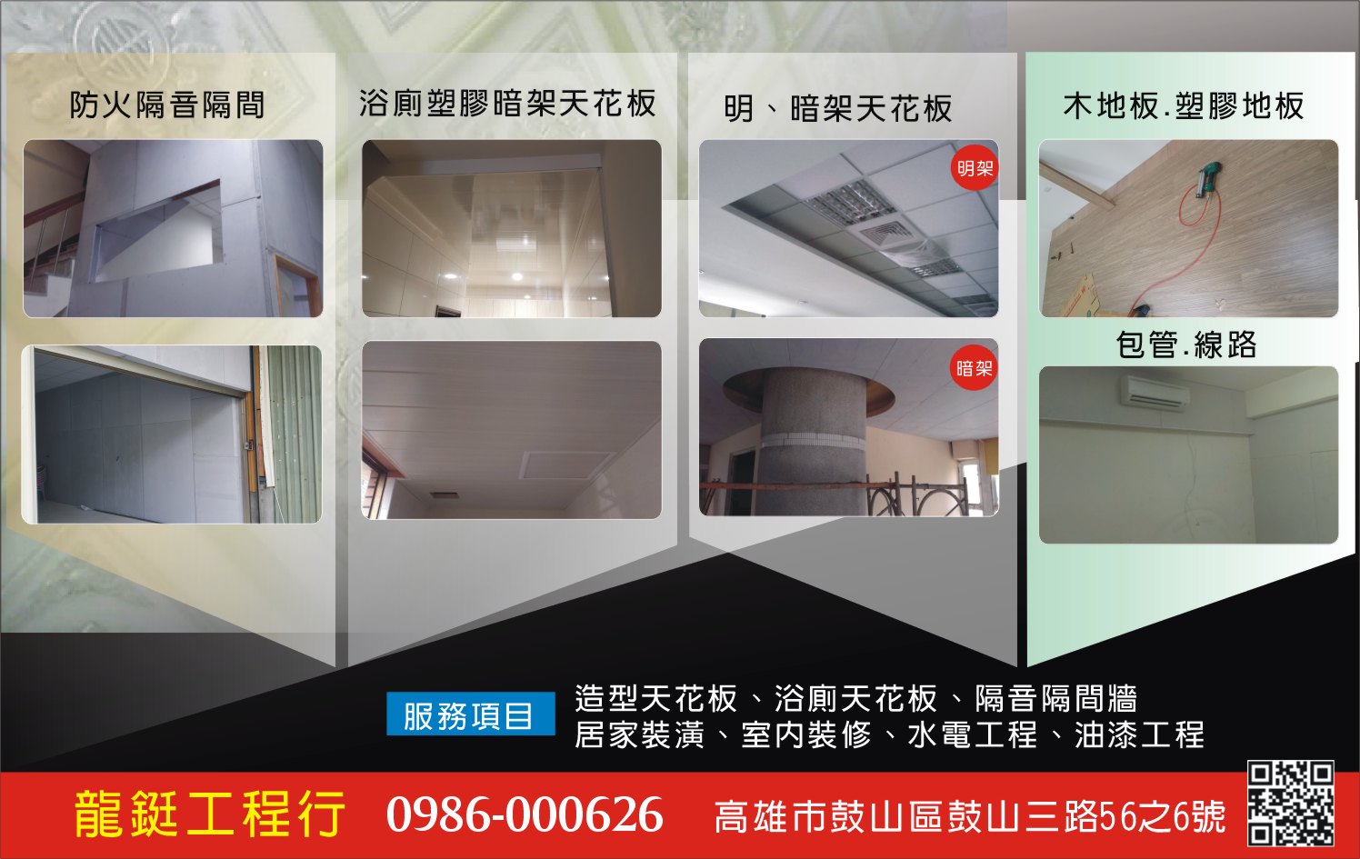 ◎服務項目:高雄輕鋼架、高雄天花板、高雄輕隔間、左營輕鋼架、左營天花板、左營輕隔間、鼓山輕鋼架、鼓山輕隔間、鼓山天花板、三民輕鋼架、三民輕隔間、三民天花板、前鎮輕鋼架、前鎮輕隔間、前鎮天花板、鳳山輕鋼架、鳳山輕隔間、鳳山天花板、造型天花板、明架天花板、暗架天花板、浴廁天花板、隔間牆、單面隔間、雙面隔間、隔音隔間牆、辦公室天花板、辦公室隔間、居家裝潢補修、拆舊裝潢、室內裝修、室內裝潢、天花板、隔間、地板、水電、油漆、防火隔音隔音、浴廁塑膠暗架天花板、木地板、塑膠地板、包管、線路