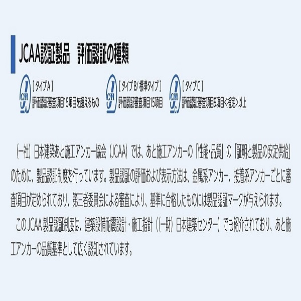 JCAA認證產品:本產品已經獲得日本建築施工錨栓協會,TYPE-B認證。