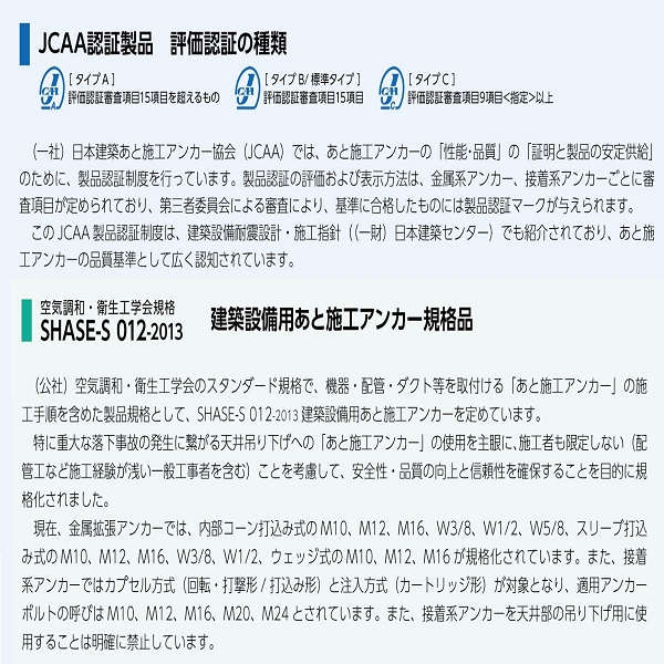 SHASE-S規格品:建築設備用施工錨栓規格品。