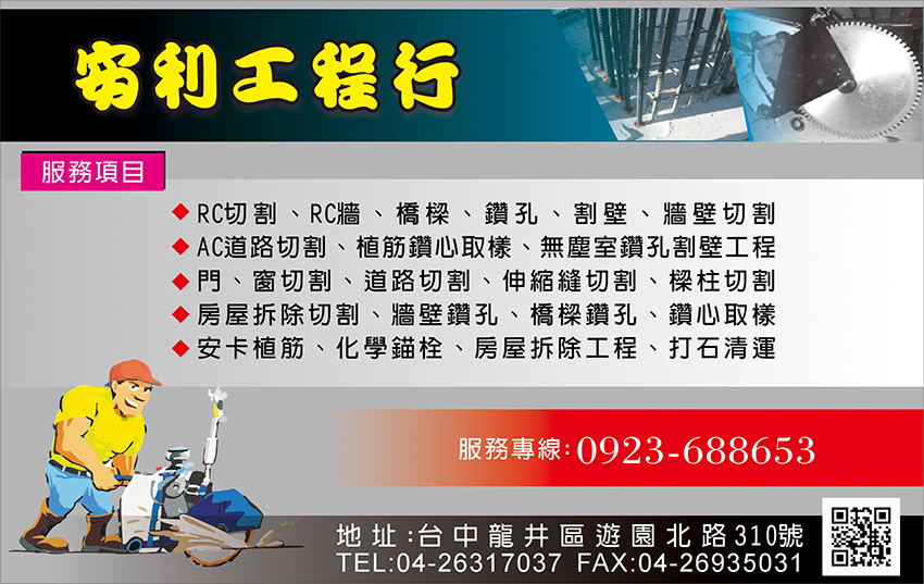 RC切割、RC牆、橋樑、鑽孔、割壁、牆壁切割、AC道路切割、植筋鑽心取樣、無塵室鑽孔割壁工程、門窗切割、道路切割、伸縮縫切割、樑柱切割、房屋拆除切割、牆壁鑽孔、橋樑鑽孔、鑽心取樣、安卡植筋、化學錨栓、房屋拆除工程、打石清運、建築物改修、電子廠房施工、無塵室施工、住家翻修改建、隔間拆除、房屋拆除工程、舊屋改建套房、消防鑽孔、水電鑽孔、空調鑽孔、大小工程承包、連續壁鑽孔、室內規劃設計、裝璜水電承包、室內裝璜拆除、地板開口切割、圾垃處理清運、拆除量多折數低、切割鑽孔、打石清運、水電鑽孔、RC牆、台中房屋拆除工程、台中RC牆、台中橋樑、台中鑽孔、RC、中部鑽孔切割