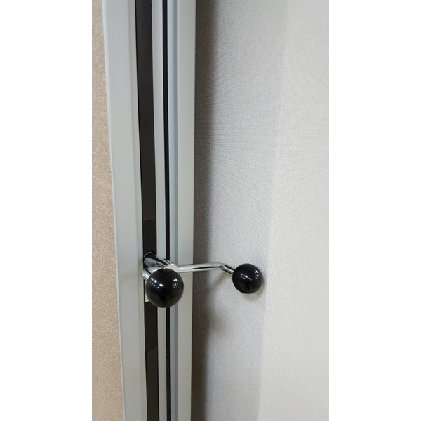 B.曲柄搖桿於框架凹槽處插入,順時針旋轉時,內部釋放機構(照片菱形區域),會撐開,使內部隱藏式上下水平隔音向上、下頂出,使框架單片固定住。