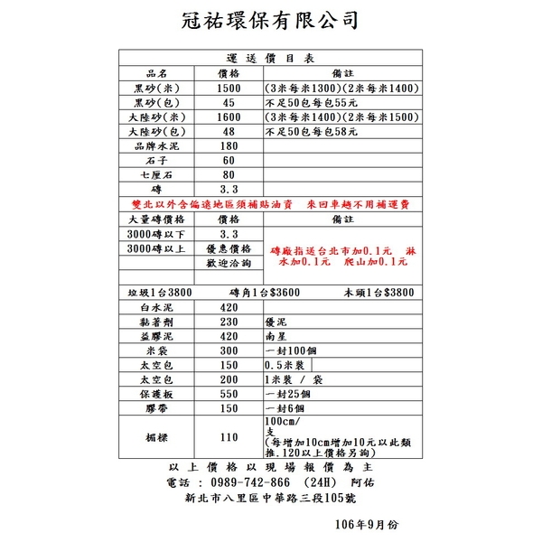 冠祐環保運送價目表產品介紹 - 冠祐環保有限公司
