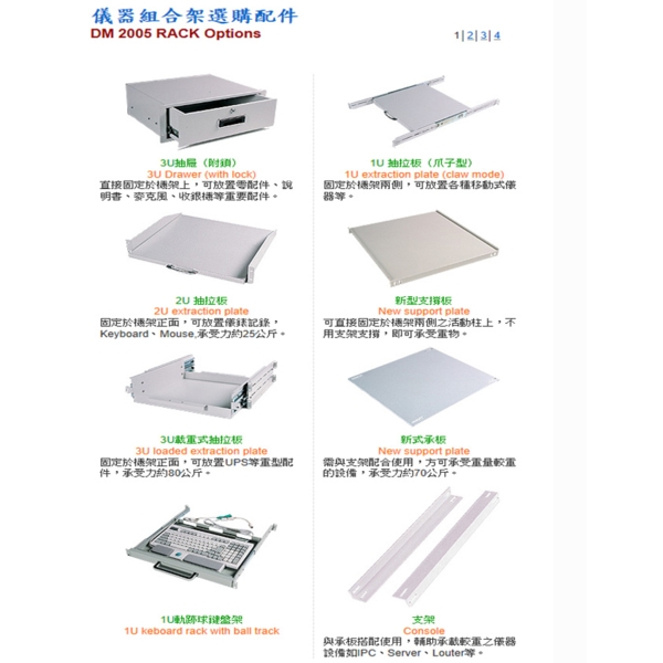 Console與承板搭配使用,輔助承載較重之儀器設備如IPC、Server、Louter等。