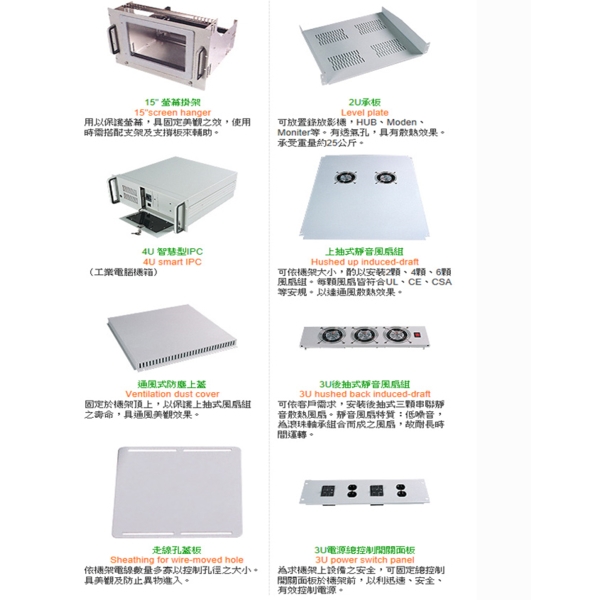 固定於機架頂上,以保護上抽式風扇組之壽命,具通風美觀效果。