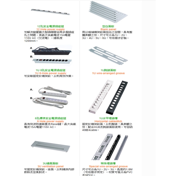 尺寸可分為1U、2U、3U,長度約1.8M(可依需求而定)。材質可區分為PVC及SPCC。