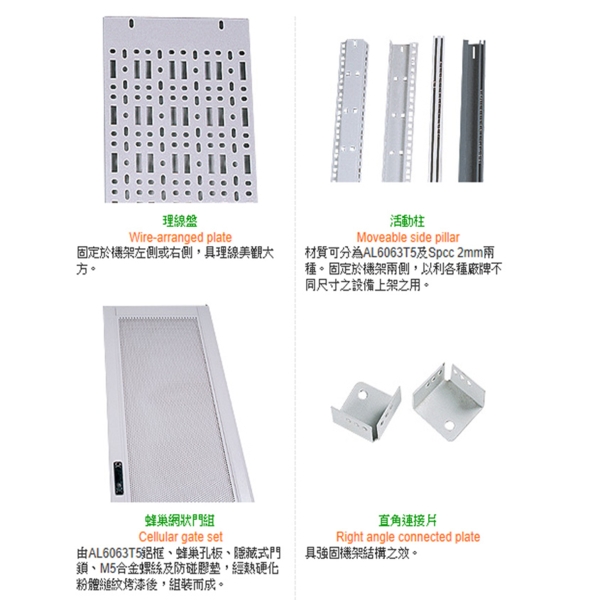 由AL6063T5鋁框、蜂巢孔板、隱藏式門鎖、M5合金螺絲及防碰膠墊,經熱硬化粉體縋紋烤漆後,組裝而成。