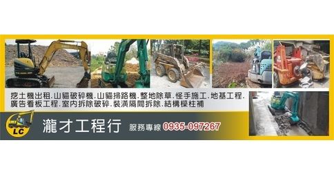 挖土機出租、山貓破碎機、山貓掃路機、整地除草、怪手施工、地基工程、廣告看板工程、室內拆除破碎、裝潢隔間拆除、結構樑柱補強、怪手出租、小乖乖挖土機出租、台北挖土機出租、小型挖土機怪手、1米迷你挖土機怪手、小乖乖鏟土機、鏟裝機夾子拆除、怪手夾子拆除、怪手拆除、挖土機夾子拆除、掃路機出租、鏟裝機夾子拆除、爪子拆除清運、園藝景觀種樹、移樹、水電信管溝、排水管、污水管化糞池埋管、廣告看板基礎、排水溝工程、電梯井工程昇降機、地基地樑基礎工程、鐵皮屋基礎基座工程、廣告看板基礎基座工程、百貨公司拆除、專業施工整地、園藝、鋪柏油、水電埋管路、瀧才工程