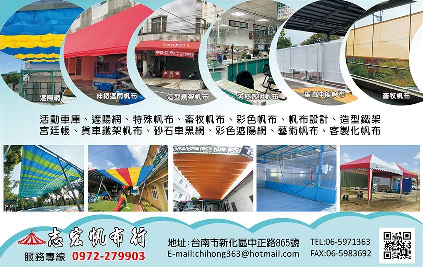 志宏鐵架帆布本公司創立秉持著平價的基本經營理念,因此得到許多客戶的支持與擁護。民國68年以台南伸縮帆布、台南遮雨帆、台南活動車庫、台南遮陽網、台南特殊帆布、台南畜牧帆布、台南彩色帆布、台南帆布設計、台南造型鐵架、台南宮廷帳、台南貨車鐵架帆布、台南砂石車黑網、台南彩色遮陽網、台南藝術帆布、台南帆布加工、台南帆布工程設計製造、台南客製化帆布等本公司的帆布相關產業也隨著不同的時期及需求不斷精進帆布本身的品質。