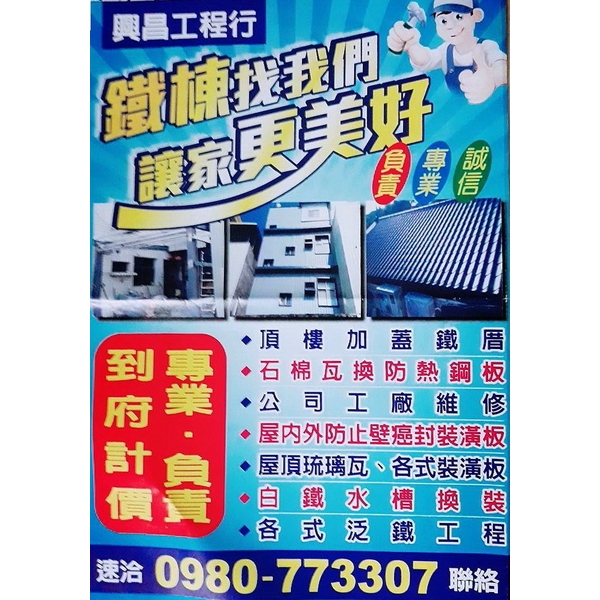 鐵棟、壁癌處理、白鐵鋼構、石棉瓦換防熱鋼板、鐵皮屋增建、頂樓加蓋鐵厝、屋頂琉璃瓦、白鐵水槽、公司工廠維修、加蓋鐵厝、屋頂維修、屋頂翻修、水槽、裝潢板、泛鐵、浪板、各類泛鐵工程、各式裝潢板、屋內外防止壁癌封裝潢板、屋頂浪板、白鐵水槽換裝、隔熱工程、屋頂隔熱、鐵皮屋頂、壁癌工程、水槽換新、裝潢鋼板、琉璃瓦鋼板、烤漆浪板、鋼構工程、鐵皮屋翻修、防壁癌封裝潢板、各式白鐵鋼構工程、彰化屋頂浪板、彰化壁癌、彰化屋頂翻修、員林屋頂浪板、員林浪板、員林壁癌、員林屋頂翻修、0980773307、興昌工程