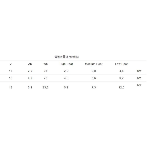 18 V / 5.2 Ah在1級電池上最多可保持12個小時的舒適溫暖,在3級電池上最多可保持5個小時的強烈溫暖。