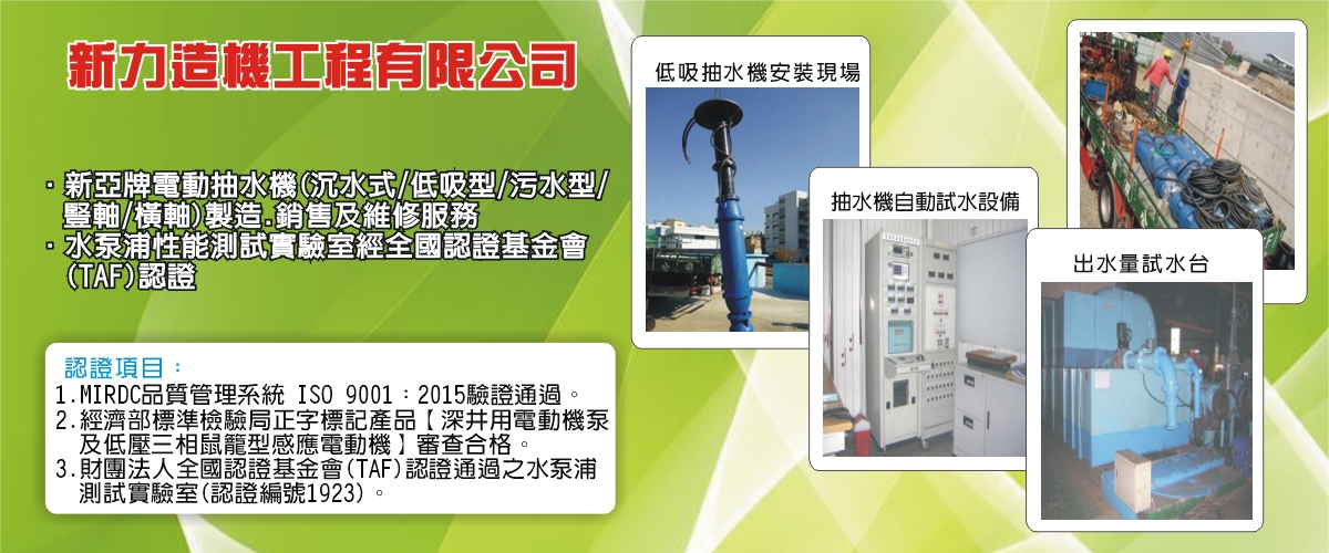 新亞牌電動抽水機(沉水式/低吸型/污水型/豎軸/橫軸)製造買賣及修理業務。