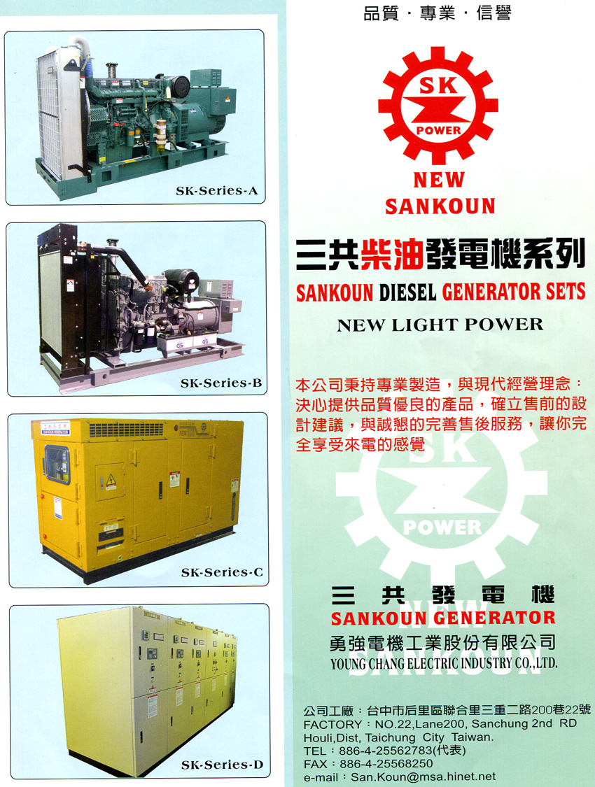 經營項目:專業製造交直流發電機、壓縮機馬達、代理歐美進口發電機、電子自動控制、三共柴油發電機、三共汽油發電機、發電機保養、維修、SANKOUNGENERATOR、三共沼氣發電機、三共瓦斯發電機、GS攜帶式系列發電機、sk防音型系列發電機、sk開放型系列發電機、沼氣發電機、瓦斯發電機、柴油發電機、汽油發電機...等。