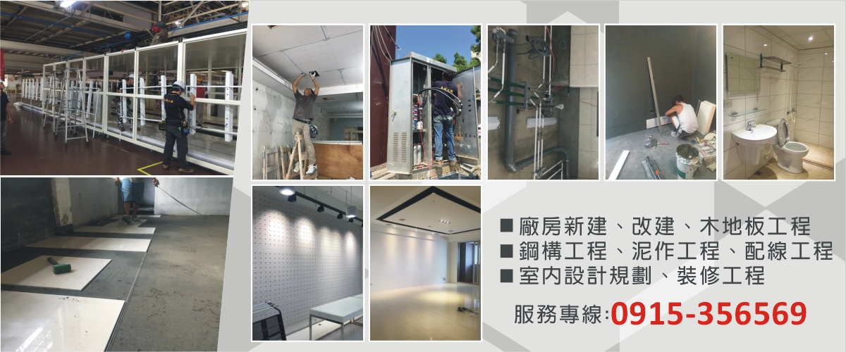 ※服務項目:廠房新建、木地板工程、鋼構工程、泥作工程、室內設計、配線工程、舊屋翻新、冷氣空調、燈具燈飾、滲漏防水、廚房整建、浴室整建、房屋新建改建、油漆粉刷、門窗更換、廚房更新、系統櫃、衛浴更新、木作工程、工廠新建、工廠改建、室內整體規劃整建、室內裝修、木牆、水電、桃園室內設計、桃園鋼構、桃園蓋廠房、桃園房屋翻修、桃園防水處理、桃園油漆粉刷