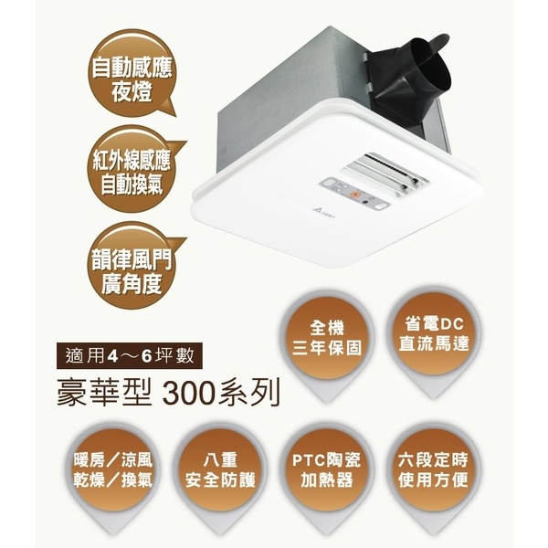 台達多功能循環涼暖風機豪華型300系列,包含暖房、涼風、乾燥、換氣四種室內循環換氣功能,具有六段定時設定。能安靜長效的協助室內換氣,採用DC 直流馬達,感應式自動換氣以及感應式LED夜燈,側吸式時尚美型面板,附抽取式長效濾網,保護機體風扇易清潔。雙重逆止風門,能緊密阻隔管道間異味。