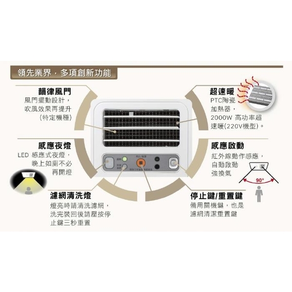 ■功能:韻律風門、高效暖房、急速乾燥、循環涼風、通風換氣、六段定時、IP67遙控器、自動感應LED夜燈、紅外線感應自動換氣、抽取式長效濾網、雙重逆止風門防止異味