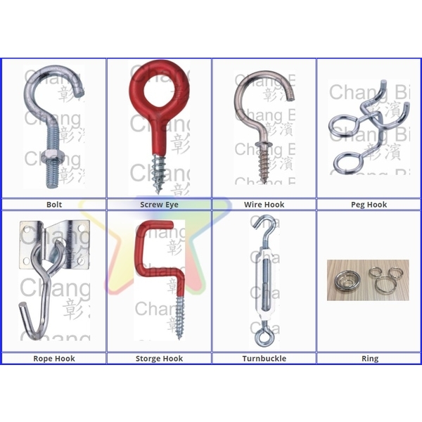 screw、nail、picture hanger hook、blot、 U bolt、eye bolt、screw eye、樣品鉤、pegboard hook、cup hook、square hook、折釘、 shook、S鉤、gate hook and eye
