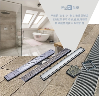 不鏽鋼排水槽、不銹鋼排水槽、不銹鋼斷水槽、不銹鋼落水頭、不銹鋼集水座、線型不銹鋼排水座、不銹鋼淋裕排水座、不銹鋼地排、方型排水座(sus304/316)、磁磚式排水座(SUS 304/316)、斷水槽、不鏽鋼製排水槽、衛浴精品配件