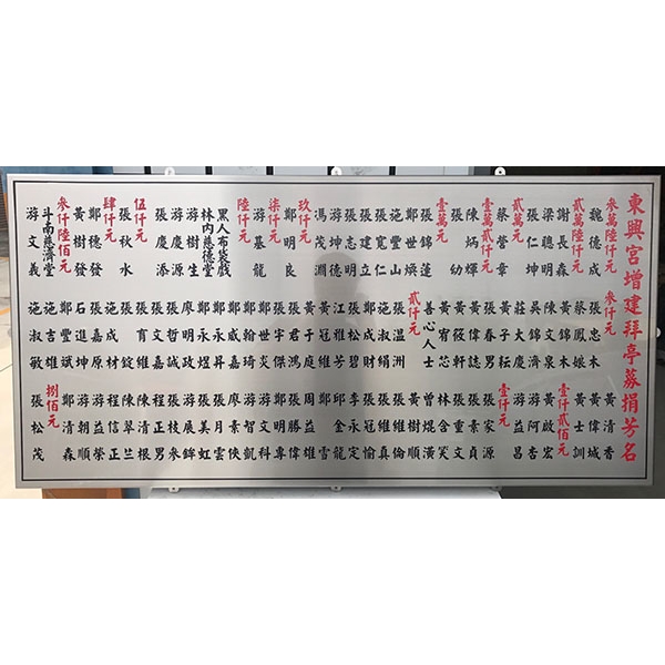 不鏽鋼銘牌、銅牌、鈦金標示牌 、波麗銘牌、壓克力銘牌、 蝕刻銘牌、工程導覽牌、竣工告示牌、植樹牌、蝕刻牌、台中銘版、蝕刻銘版、印刷銘版、控制面版、機械銘版 、車飾銘牌、電鑄銘版、輪弧模具蝕刻、刻特殊紋路、禮品類、社團徽章、紀念章、鑰匙圈、紀念幣、手機吊飾、行李吊牌、職務名牌、蝕刻書籤、宗教文物商品類、羅盤銅面製作、行車吊飾、平安符、祈福卡、廣告標示類、工程導覽牌、三角桌牌、門牌、獎牌職務名牌、