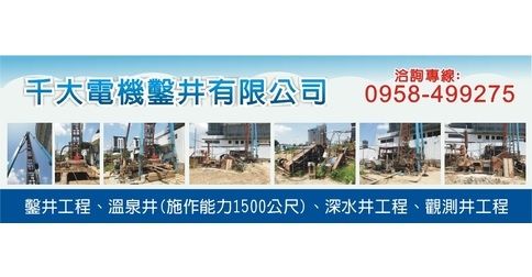 鑿井工程、溫泉井、深水井工程、觀測井工程、鑽鑿水井、抽水機、洗井、接地井工程、機械式鑿井工程、機械式洗井工程、鑽堡鑿井工程、點井工程、農業用井、供水鑿井、改善飲用水鑿井工程、溫泉探勘、地下水鑿井、申請水權、家庭飲水、工業用水、洗井維修、深水馬達、臺北鑿井工程、新北鑿井工程、桃園鑿井工程、臺中鑿井工程、臺南鑿井工程、高雄鑿井工程、宜蘭鑿井工程、新竹鑿井工程、彰化鑿井工程、南投鑿井工程、雲林鑿井工程、嘉義鑿井工程、屏東鑿井工程、花蓮鑿井工程、臺東鑿井工程、基隆鑿井工程、新竹鑿井工程、嘉義鑿井工程、千大電機鑿井、千大電機、千大