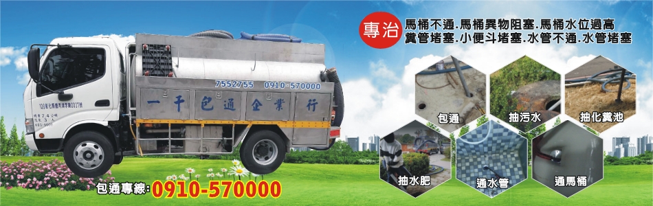 一千包通企業行擁有數十年以上的經驗,舉凡:馬桶不通、馬桶異物阻塞、馬桶水位過高、糞管堵塞、小便斗堵塞、彰化抽肥,彰化抽化糞池,水泥牆壁切割,馬桶安裝,馬通水箱安裝,皆可找我們 。或是:廚房油垢堵塞、浴室毛髮堵塞或是水泥堵塞等水管不通,頂樓水管不通、陽台水管不通、廚房水管不通、廁所水管不通、浴室水管不通、水管不通、水管堵塞,均可解決,一千包通擁有專業的包通技能、通管技術與親切的服務態度。